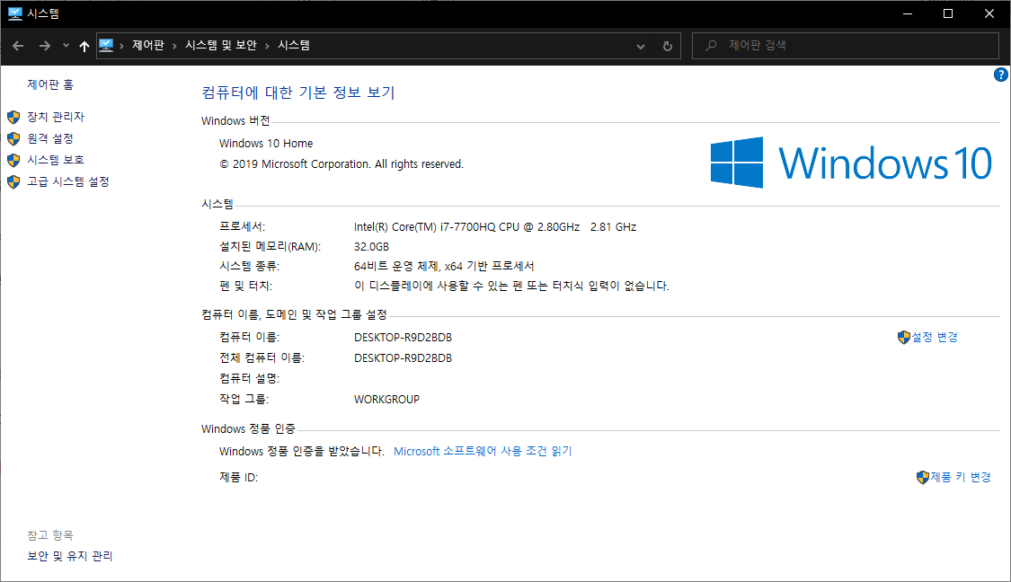 1. 윈도우 키 + Pause(Break) 키를 동시에 눌러 '시스템' 창을 엽니다.