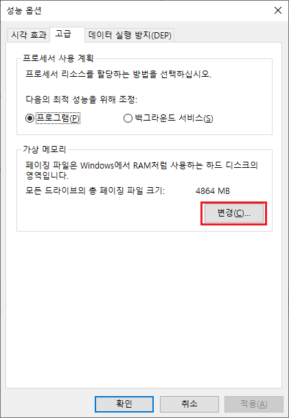 3. 성능 옵션에서 '가상메모리'에 있는 '변경'을 누릅니다.