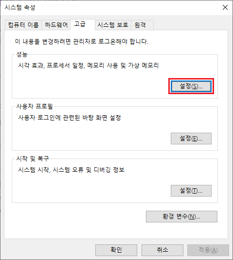 2. 왼편에 있는 '고급 시스템 설정'을 누르시면 위에 있는 '성능'에 있는 '설정'을 눌러줍니다.