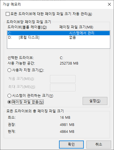 이 방법을 사용하면 페이징 파일이 생성되지 않아 가상메모리를 사용할 수 없게 됩니다.