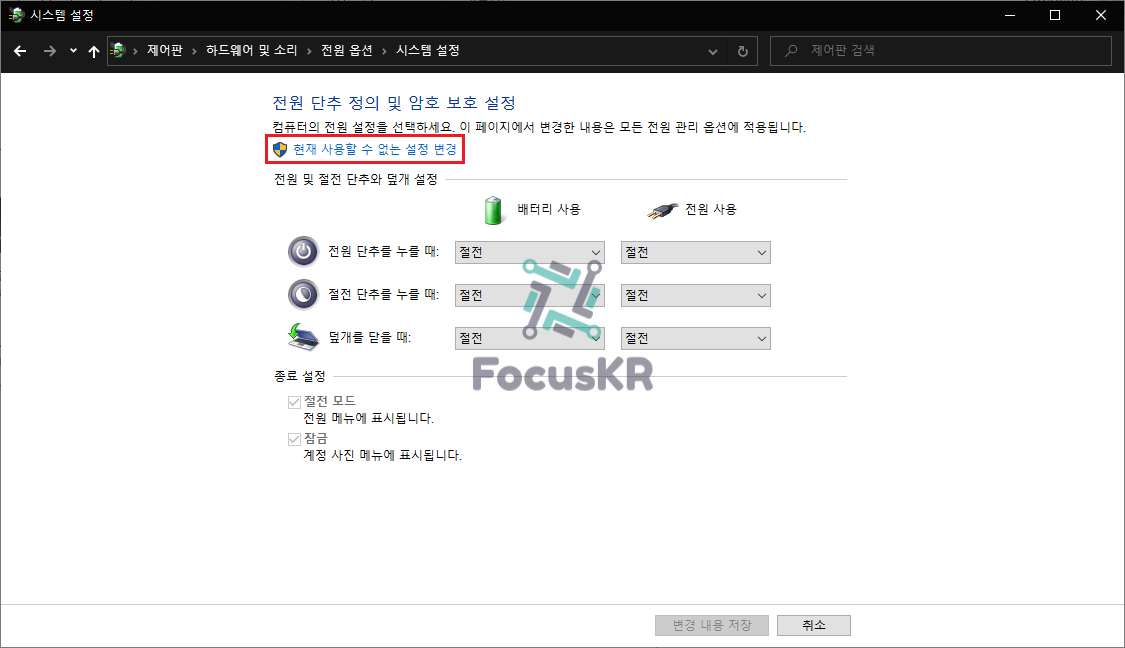 3. 위에 있는 '현재 사용할 수 없는 설정 변경'을 누르시고 '종료 설정'에 있는 '빠른 시작 켜기 (권장)'을 꺼주시면 됩니다.