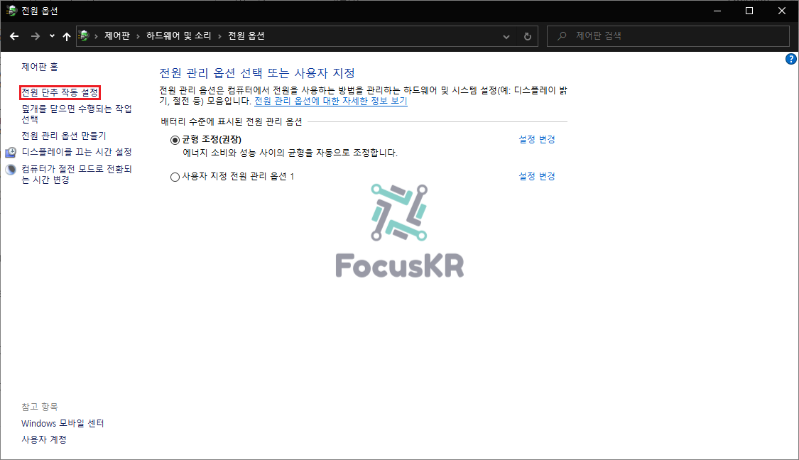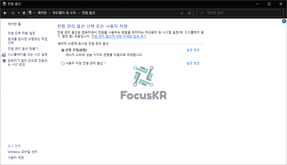1. 제어판 => 하드웨어 및 소리 => 전원 옵션에 들어갑니다.