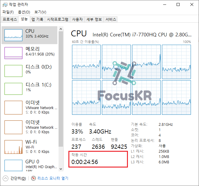 윈도우10 시스템 작동 시간이 재부팅이나 전원을 껐다가 켜도 누적이 되는 것입니다.