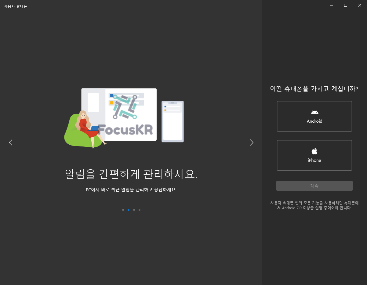 이번에는 삼성 갤럭시 스마트폰과 윈도우10을 연동하여 휴대폰 알림, 문자 메세지, 스마트폰 원격을 할 수 있는 방법을 알려드리겠습니다.