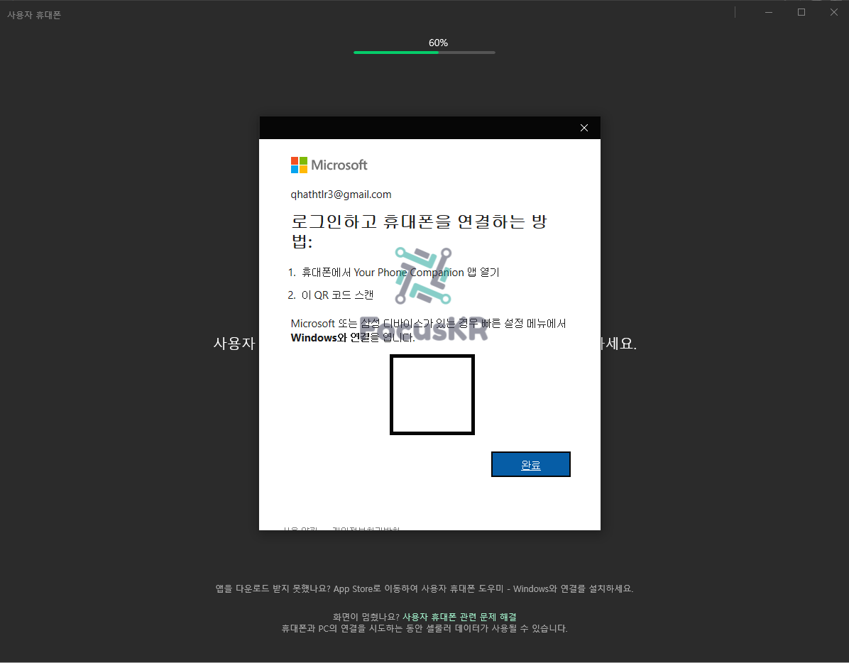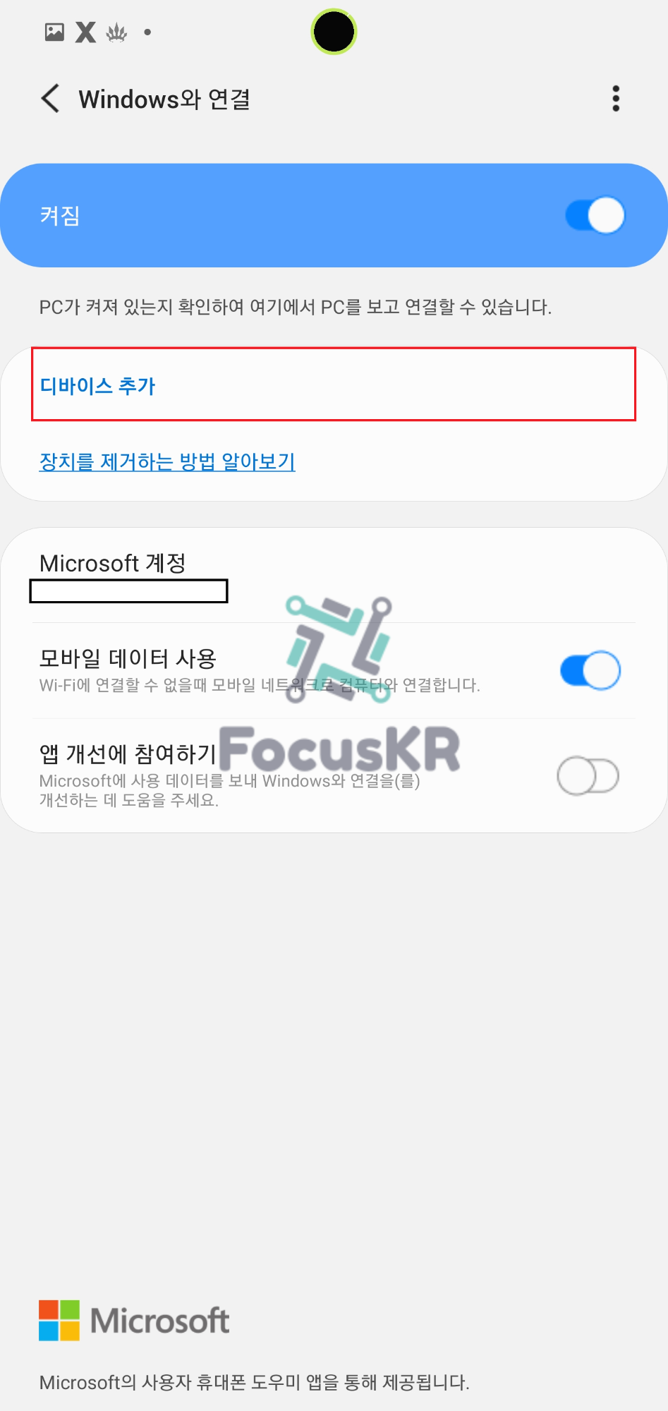 5. 스마트폰에서 'Windows와 연결'을 켜주신 다음 'Microsoft 계정'을 눌러 '사용자 휴대폰'에 나오는 QR코드를 인식시켜 줍니다.