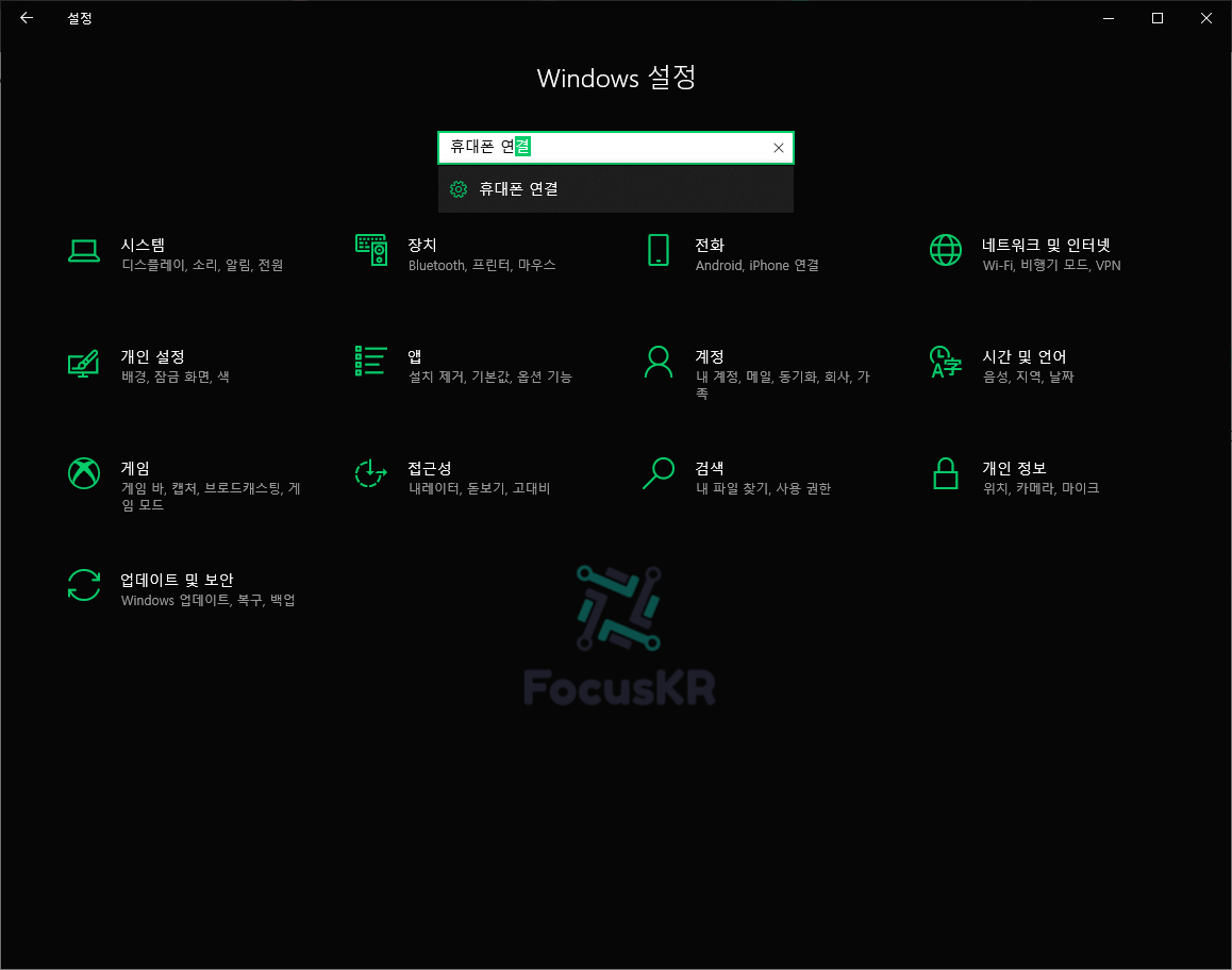 1. 윈도우키 + i 를 동시에 눌러 '설정' 창을 열고 '휴대폰 연결'을 검색합니다.