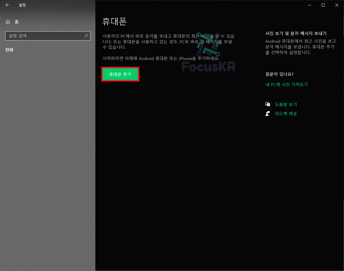 2. 휴대폰 연결에서 '휴대폰 추가'를 누릅니다.