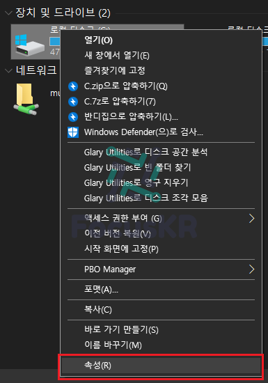 1. C드라이브에 오른쪽 마우스 클릭 후 '속성'을 클릭합니다.