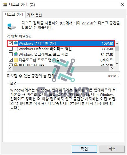 4. 'Windows 업데이트 정리'를 선택한 후 '확인'을 눌러 정리해줍니다.