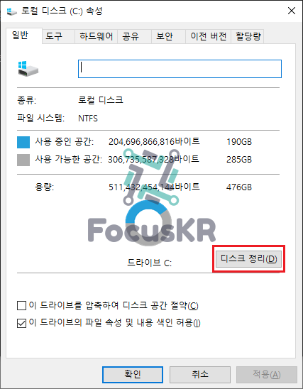 2. 속성 창에서 '디스크 정리'를 클릭합니다.