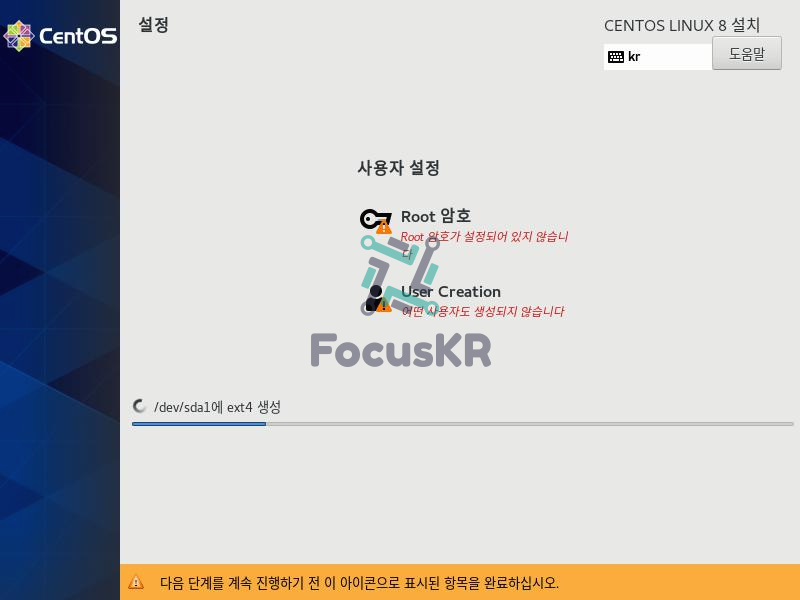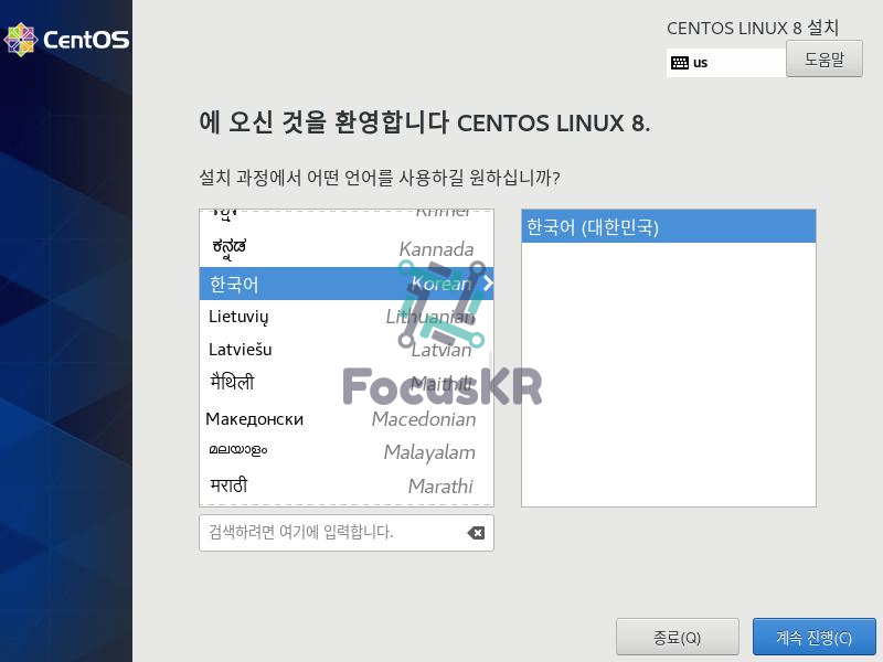 4. CentOS 인스톨러가 시작되면 한국어로 설정하고 '계속 진행'을 누릅니다.