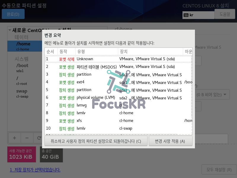 8. 파티션 설정이 완료되었다면 '완료'를 누르고 '변경 사항 적용'을 눌러 적용합니다.