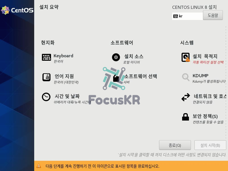 9. 이제 '설치 목적지'에 경고가 없어지고 '설치 시작'을 누를 수 있는데 눌러서 설치를 진행합니다.