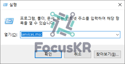 1. 윈도우 + R 을 눌러 실행을 여신 다음, 'services.msc' 를 입력 후 엔터를 누릅니다.