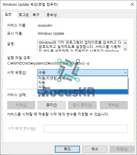 3. 해당 서비스를 '사용 안 함'으로 변경하고 서비스를 중지합니다.