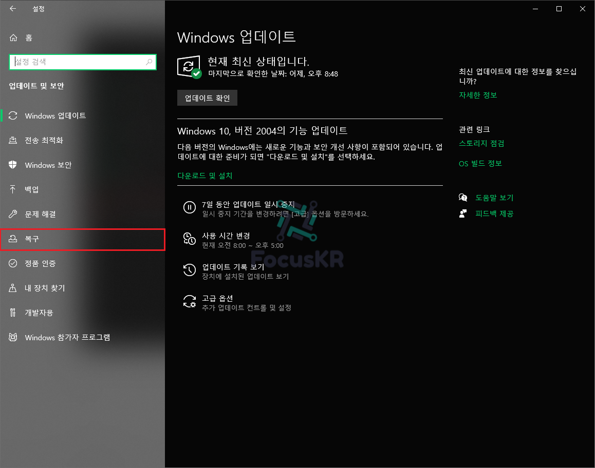 2. 왼쪽 탭에서 '복구'를 선택합니다.