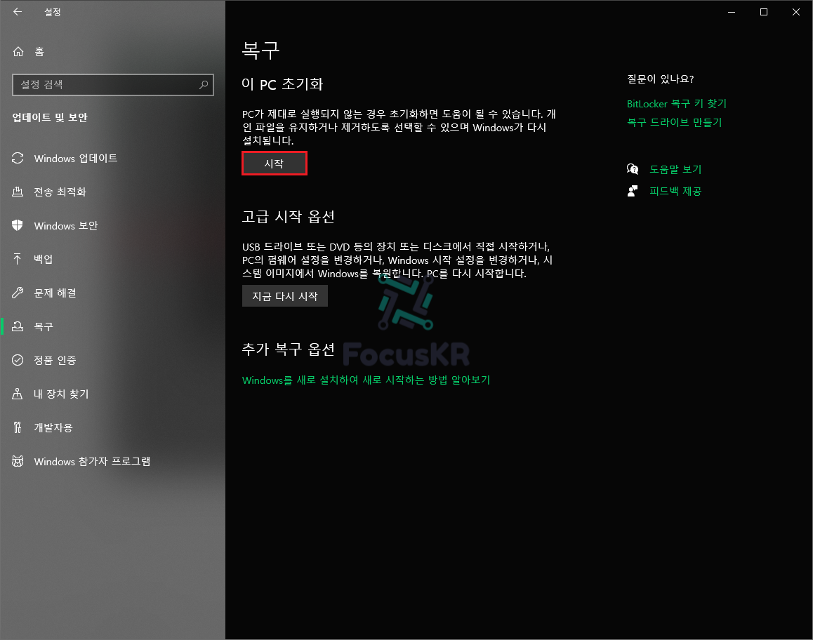 3. 이 PC 초기화에서 '시작'을 누르면 초기화 과정을 거치실 수 있습니다.