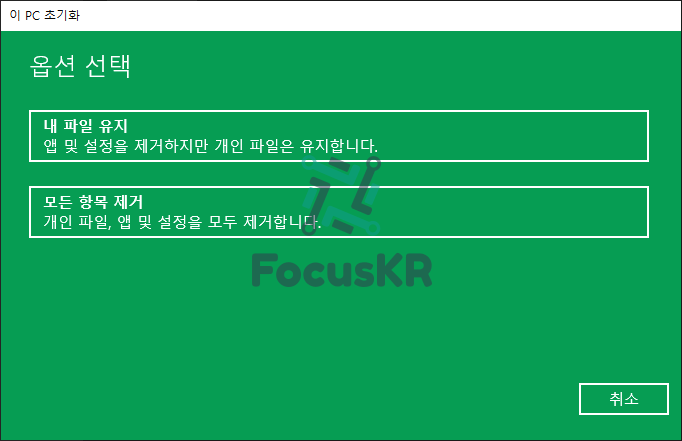 4. 초기화를 하실 때 개인 파일은 남길 것인지, 완전 초기화를 할 것 인지 선택하실 수 있습니다.