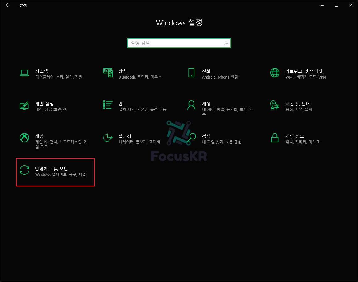1. 윈도우 키와 i 를 동시에 눌러 설정을 열고 '업데이트 및 보안'을 누릅니다.