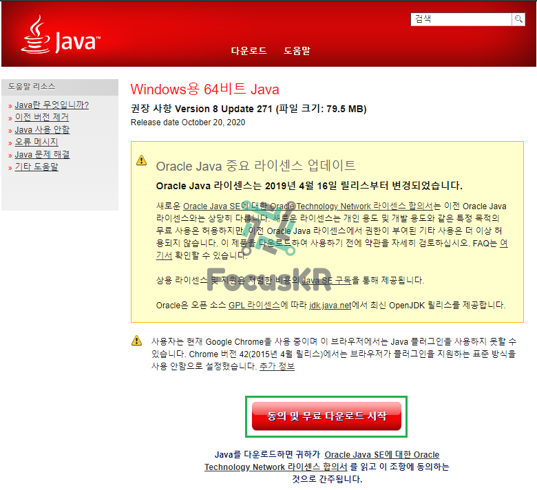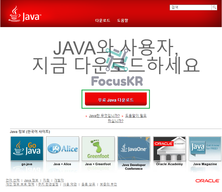 1. java.com으로 접속하여 '무료 Java 다운로드'를 누릅니다.