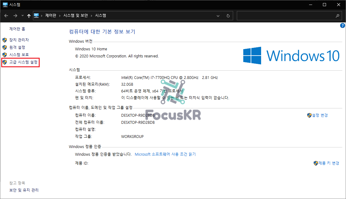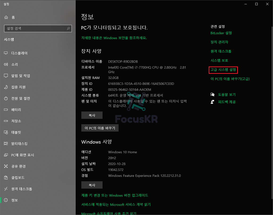 3. 윈도우 키 + PAUSE 키를 동시에 눌러 시스템 속성을 열고 우측에 '고급 시스템 설정'을 누릅니다.