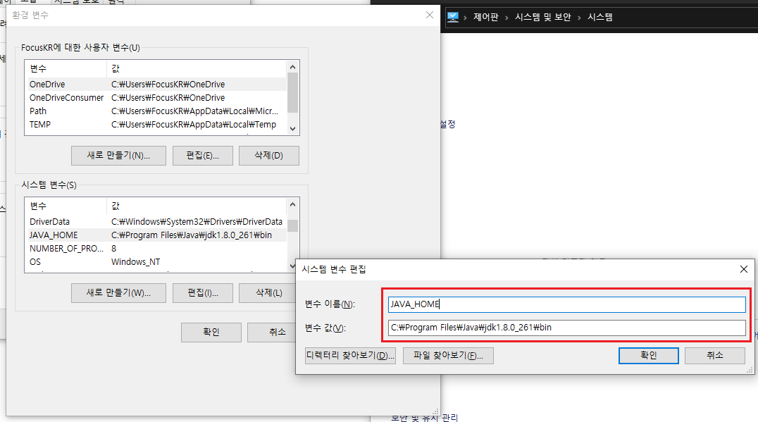 | 변수 이름: JAVA_HOME 변수 값: 자바 설치 경로 (버전에 따라 다릅니다.) |