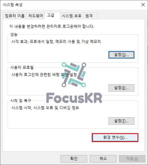 5. 시스템 변수에 새로 만들기를 눌러 아래와 같이 설정하고 확인을 누릅니다.