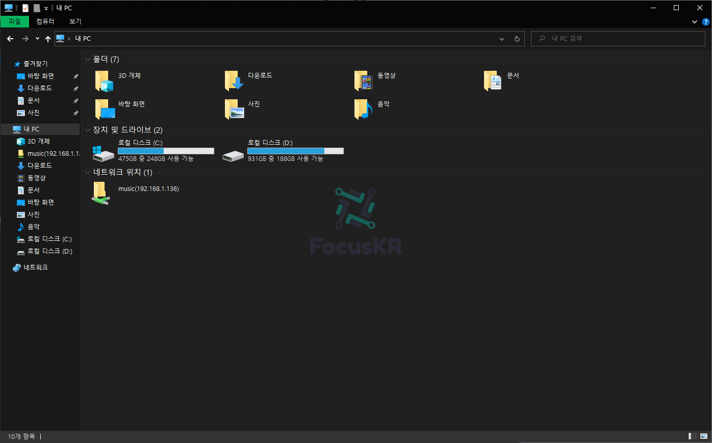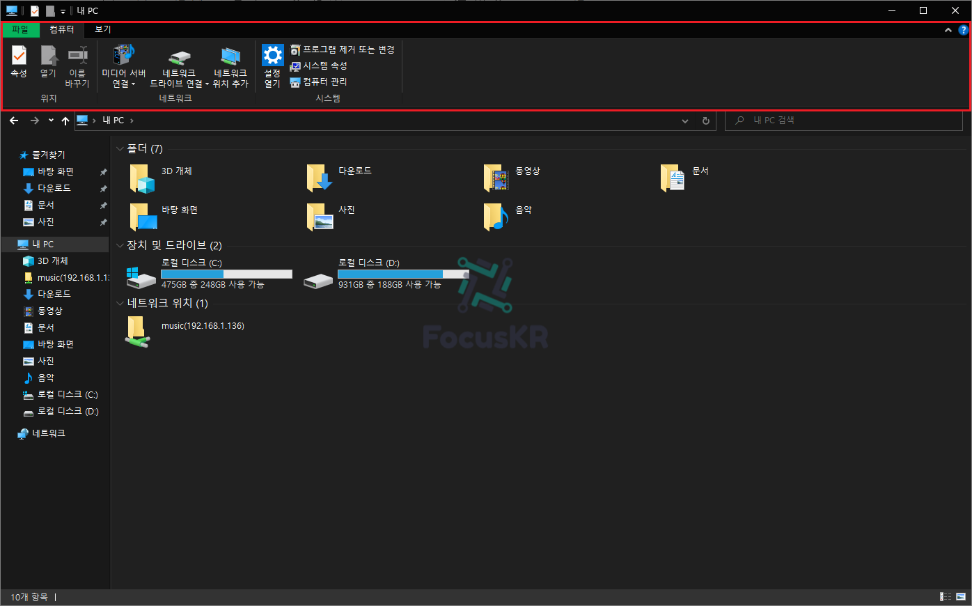 윈도우10 파일 탐색기 상단은 마치 오피스처럼 메뉴와 기본적인 기능 부분을 포함하고 있습니다.