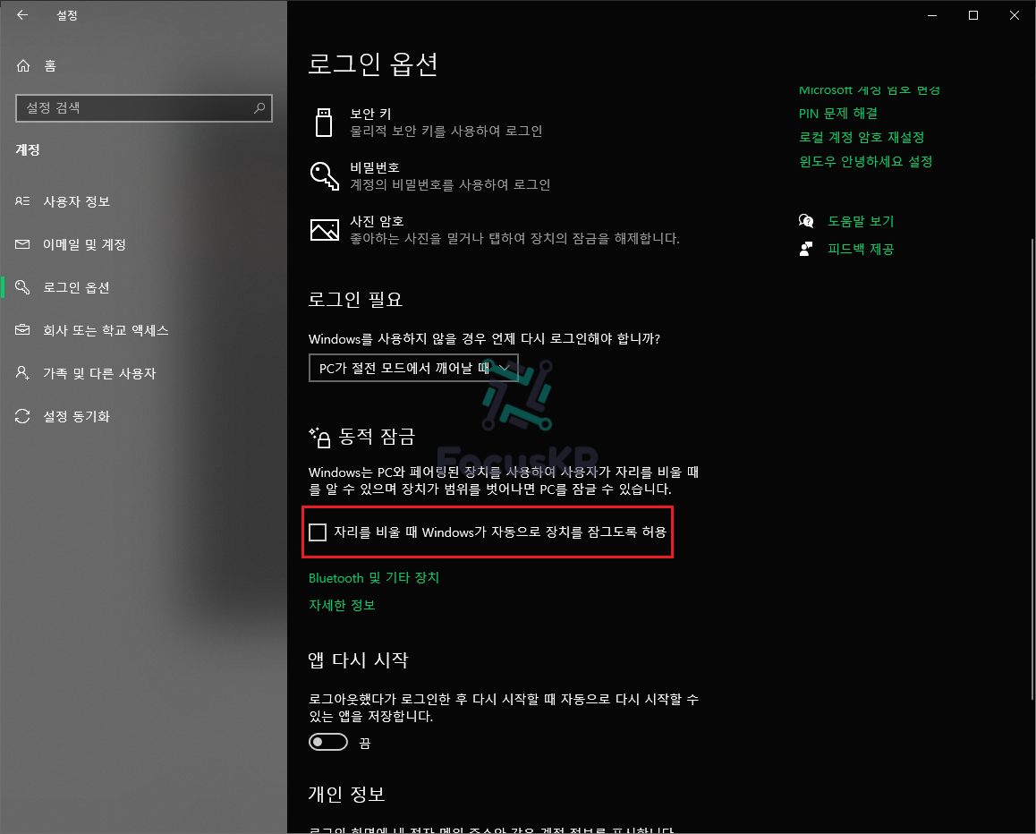 3. 중간에 있는 '동적 잠금'에서 '자리를 비울 때 Windows가 자동으로 장치를 잠그도록 허용'을 체크합니다.