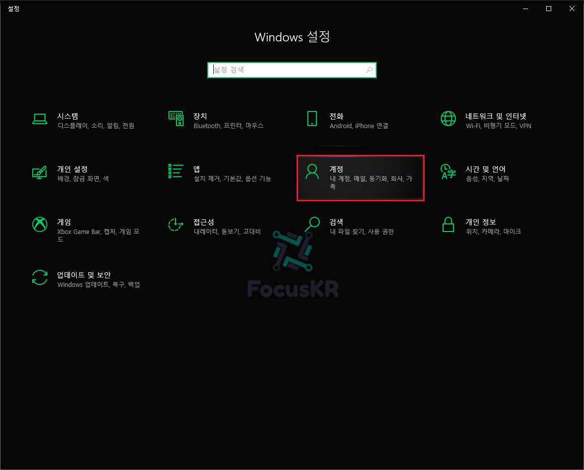 1. 윈도우 키와 i를 동시에 눌러서 '설정' 창을 여시고 '계정' 메뉴를 클릭합니다.