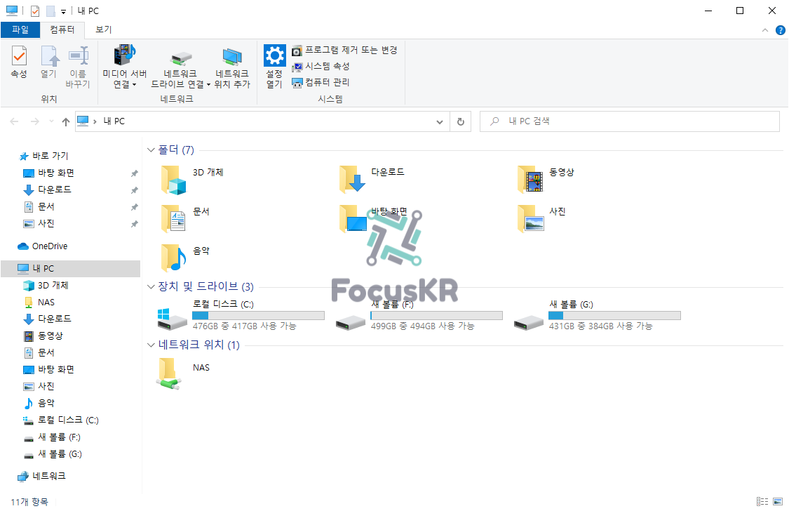 이렇게 하면 아래 이미지와 같이 윈도우7 처럼 새 탐색기를 열 때마다 로컬 디스크가 보이게 됩니다.