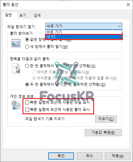 2. 상단에 있는 '파일 탐색기 열기'에서 '내 PC'로 변경하고 하단에 있는 '개인 정보 보호'를 모두 체크 해제해줍니다.