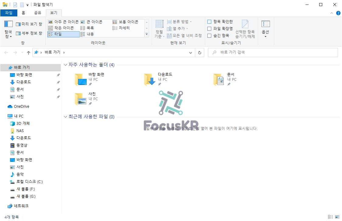윈도우10은 기본적으로 새 탐색기를 열게 되면 최근에 열었던 폴더나 파일 리스트가 보이게 됩니다.