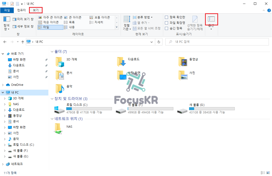 1. 새 탐색기에서 상단 탭 '보기'에서 '폴더 옵션' 아이콘을 눌러줍니다.
