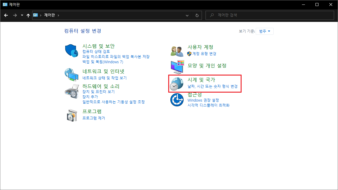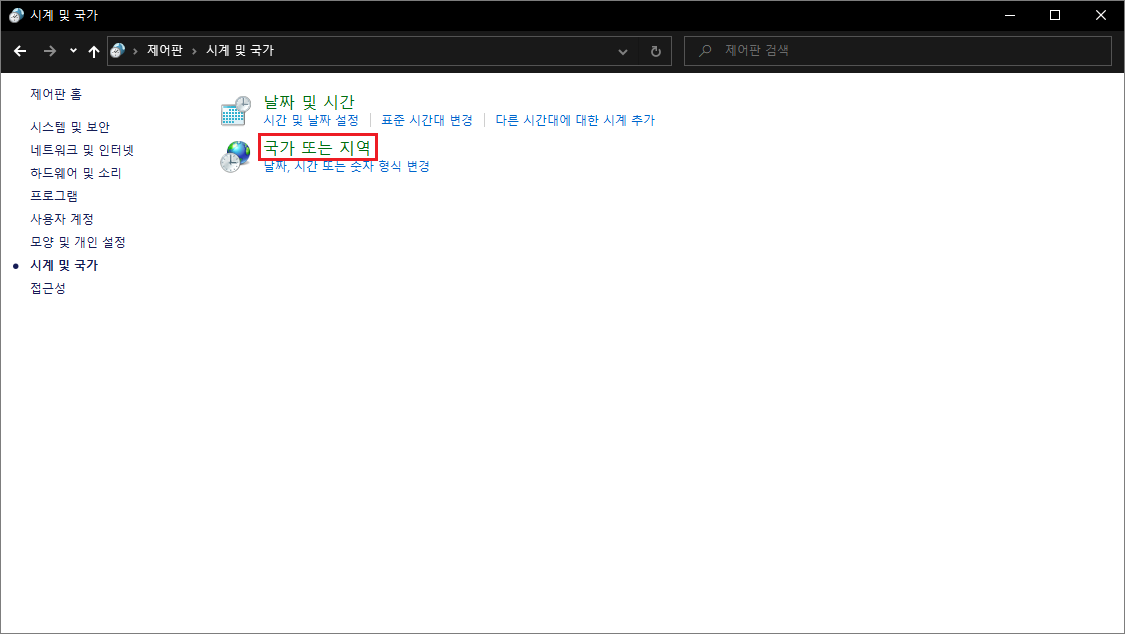 1. 제어판에서 '시계 및 국가'를 선택합니다.
