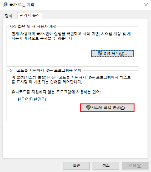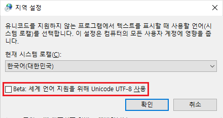5. 'Beta: 세계 언어 지원을 위해 Unicode UTF-8 사용'이 체크되어 있으면 체크 해제합니다.