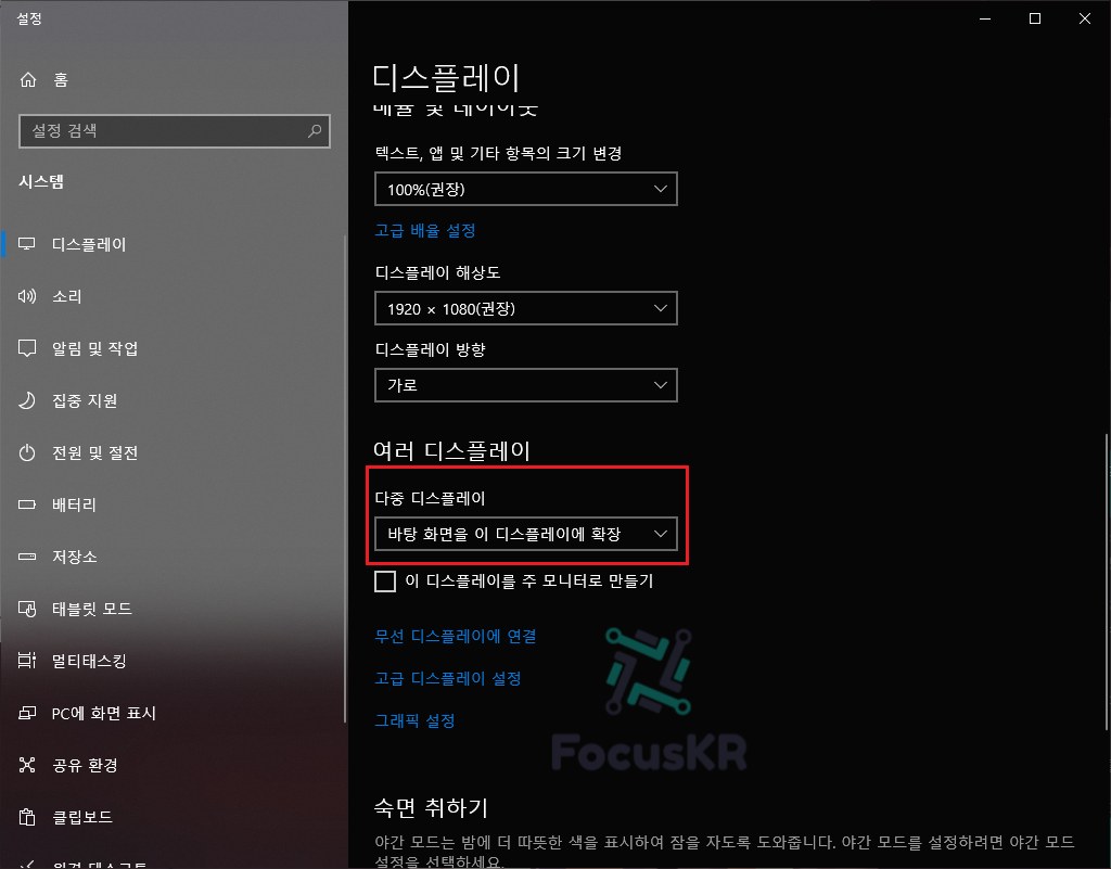 반드시 3번째 모니터가 확장되려면 위와 같이 3번째 모니터도 '바탕화면을 이 디스플레이에 확장'을 선택하셔야 합니다.