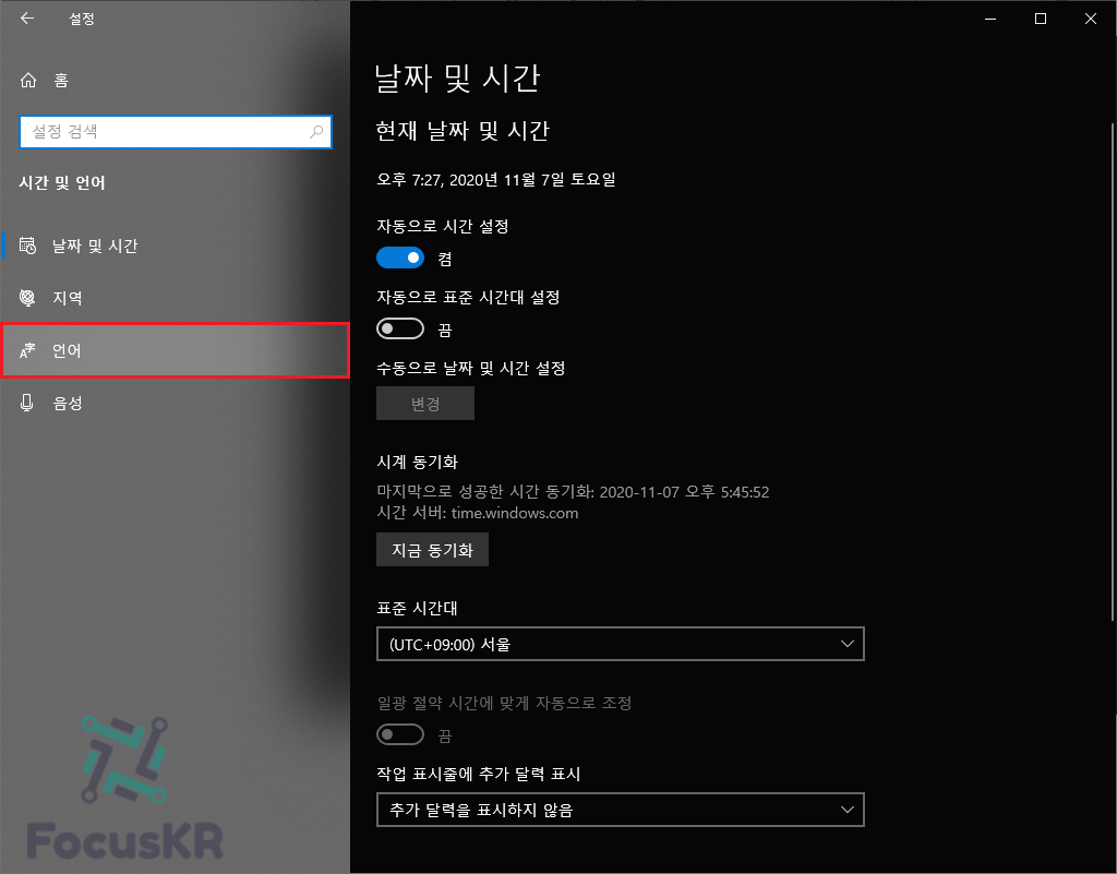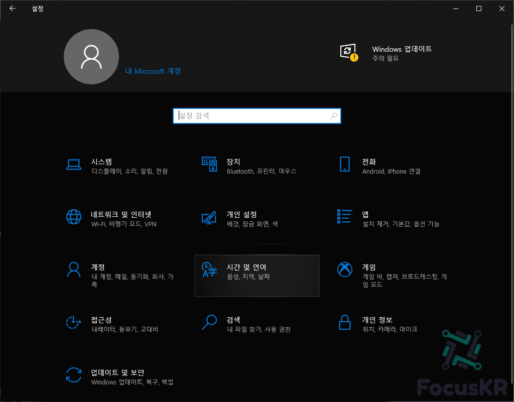 1. 윈도우 키와 i를 동시에 눌러 설정을 열고 '시간 및 언어'를 누릅니다.