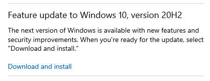 2. 중간에 있는 20H2 안내 메세지가 보이신다면 '다운로드 및 설치'를 누르시면 설치하실 수 있습니다.