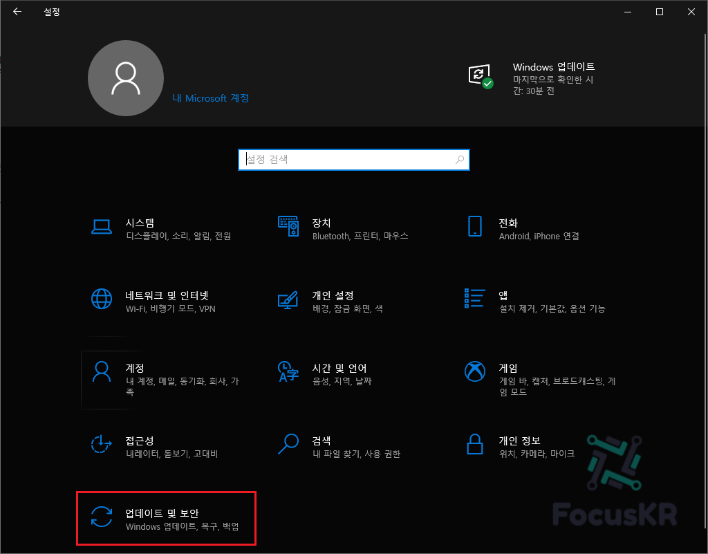 1. 윈도우 키와 i를 동시에 눌러 설정을 여시고 '업데이트 및 보안'으로 이동합니다.