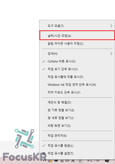 1. 작업표시줄에 있는 시간에 오른쪽 마우스 후 '날짜/시간 조정'을 클릭합니다.