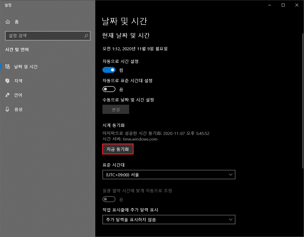 2. 시계 동기화에서 '지금 동기화'를 눌러주면 새로 동기화할 수 있습니다.