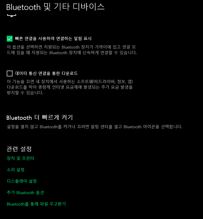 윈도우10 블루투스 설정에 들어가시면 해당 탭이 나오는데 여기에서 "빠른 연결을 사용하여 연결하는 알림 표시"의 체크를 해제해주시면 됩니다.