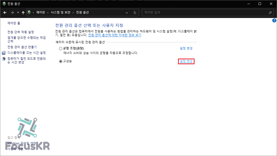 3. 현재 사용 중인 전원 옵션에서 '설정 변경'을 눌러줍니다.