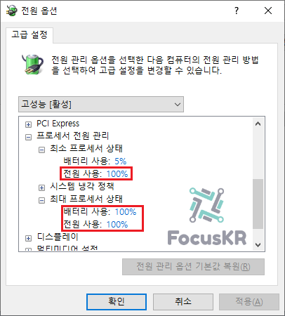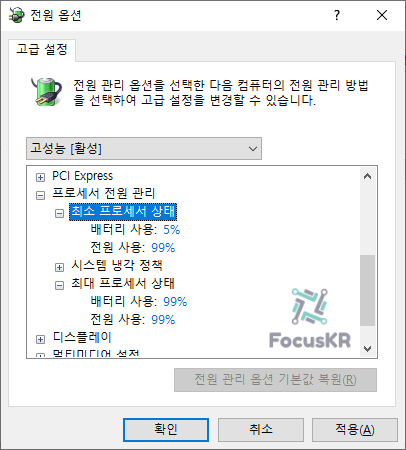 5. '프로세서 전원 관리' - '최소 프로세서 상태'와 '최대 프로세서 상태'에 있는 '전원 사용'과 '배터리 사용'에서 100%를 99%로 변경합니다.
