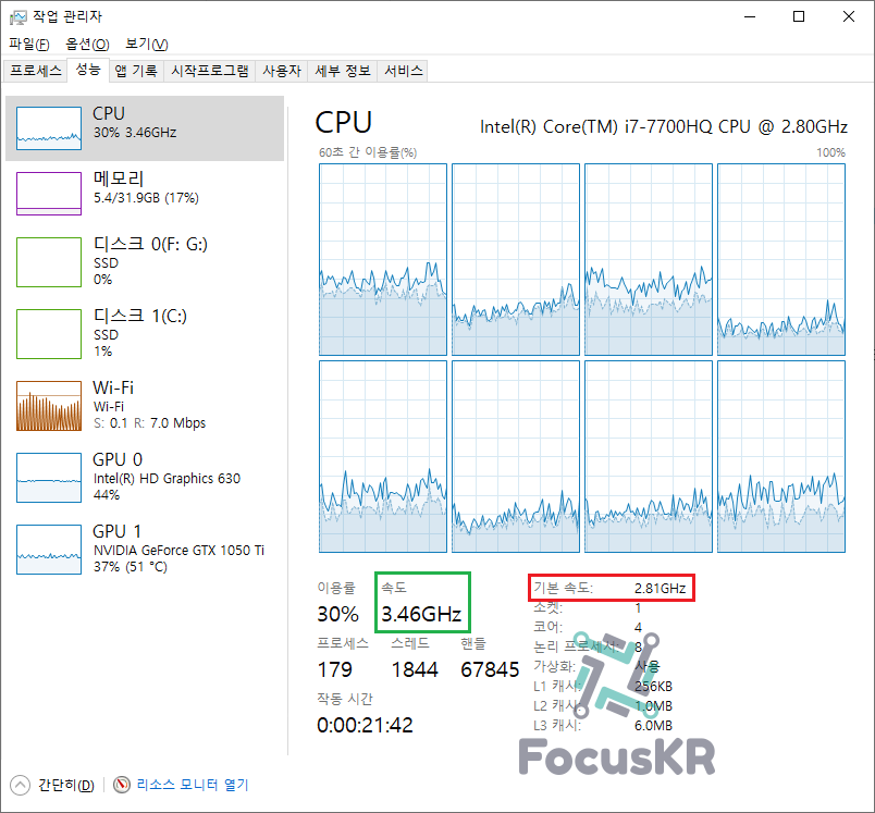 필자의 노트북을 보면 기본 속도는 2.81 Ghz이지만 실제 속도는 3.46 Ghz로 동작하고 있습니다. 이와 같이 노트북에서도 오버클럭이 되고 있다는 것을 할 수 있습니다.