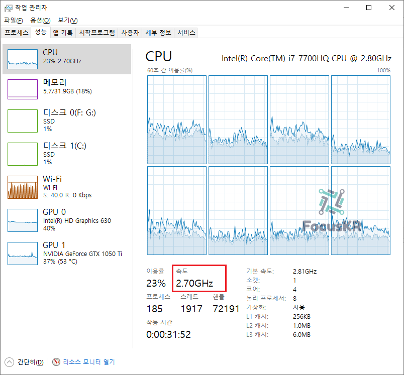 6. 변경하고 적용하는 바로 작업 관리자를 확인하면 표준 클럭 수준으로 고정되는 것을 확인하실 수 있습니다.