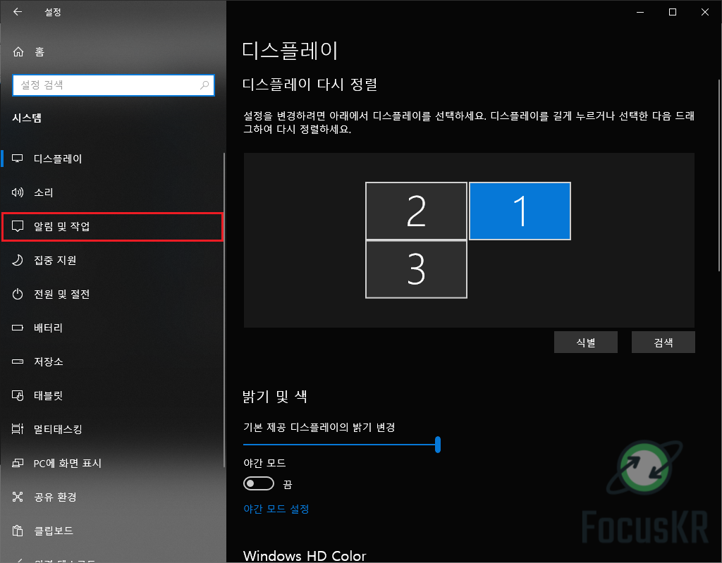 2. 측면메뉴 '알림 및 작업'을 눌러줍니다.