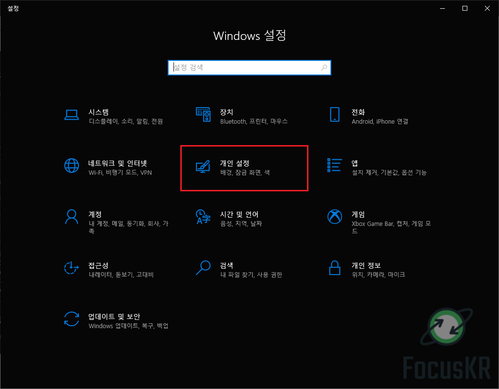 4. 다시 설정으로 돌아와서 '개인 설정'을 눌러줍니다.