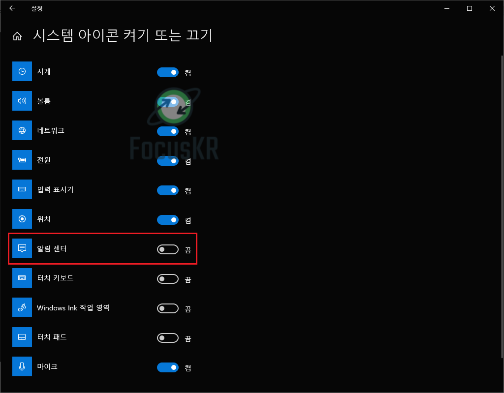 7. 중간에 있는 '알림 센터'를 꺼줍니다.